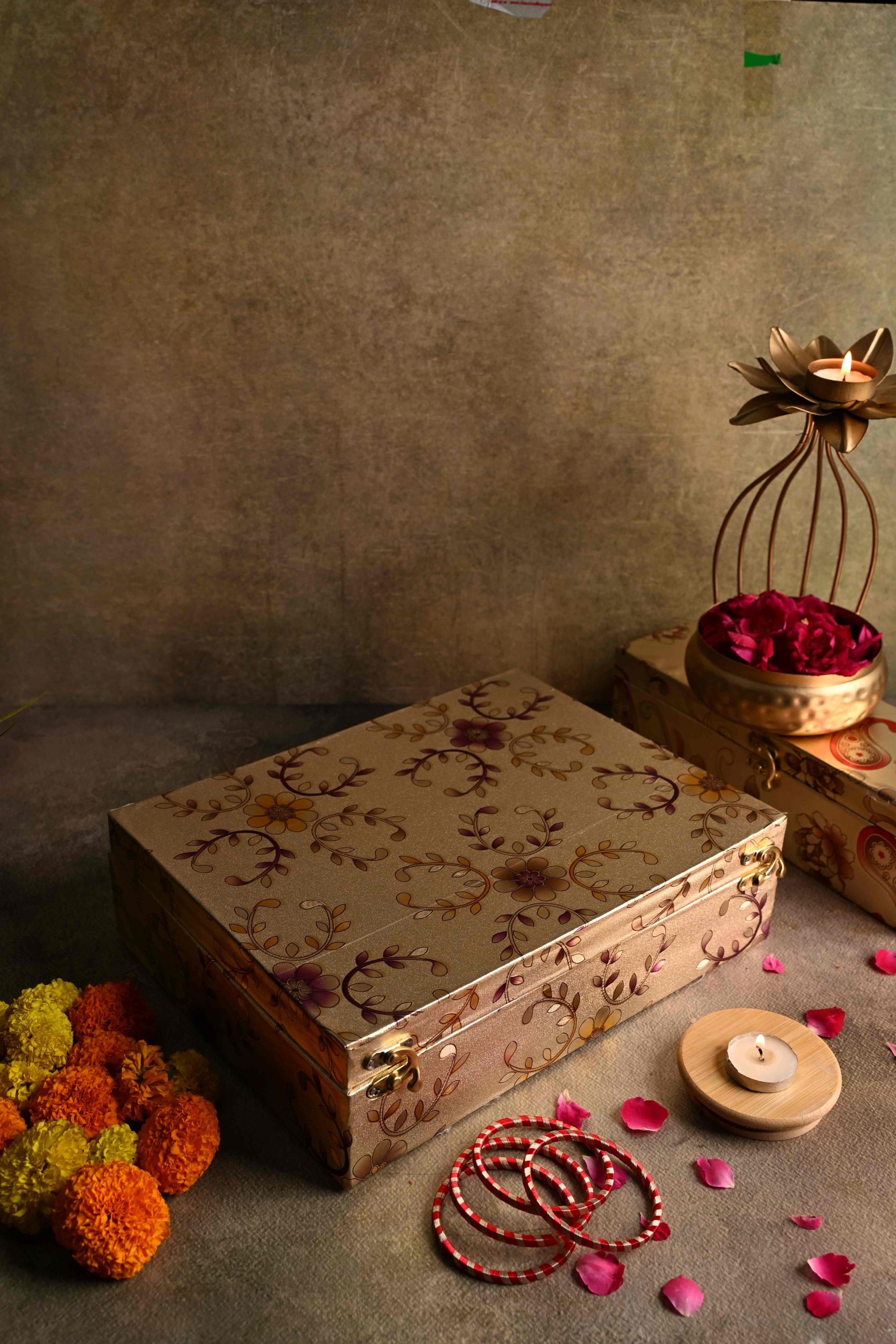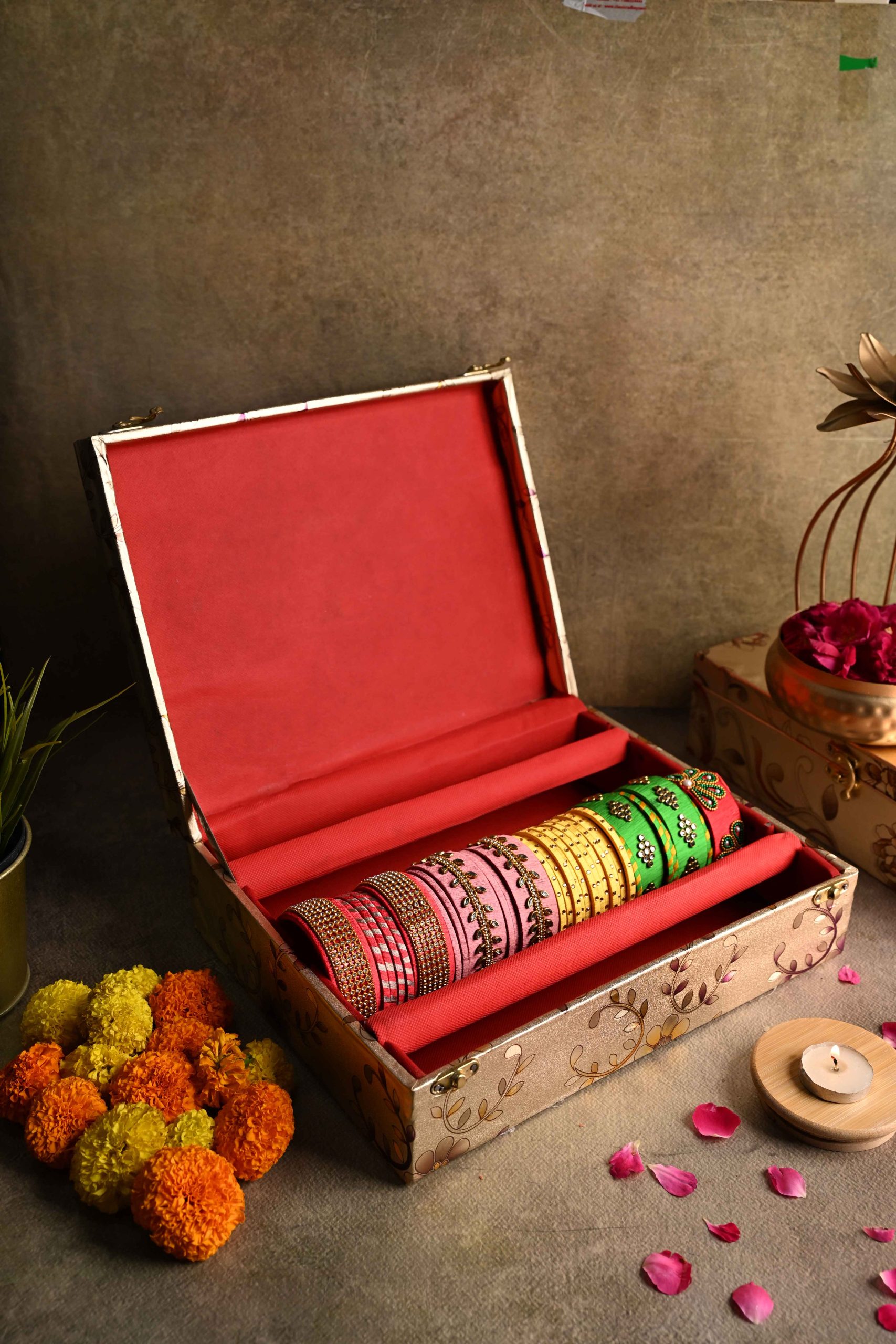 This is a beautifully crafted decorative bangle box, ideal for storing and organizing a collection of traditional Indian bangles. The box is made with quality materials and features a sturdy structure with an elegant, floral-pattern outer casing and a soft, vibrant red interior to protect jewelry from scratches and damage. Its design is both functional and ornamental, making it suitable for festive occasions, gifting, or personal use. The product is likely handcrafted or semi-handcrafted, reflecting attention to detail and cultural artistry. Made in India, it stands out for its traditional aesthetics combined with practical storage, representing a blend of cultural heritage and everyday utility.