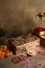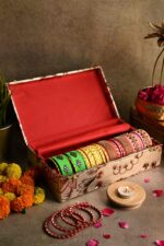 This is a beautifully handcrafted bangle storage box, designed to hold and display traditional Indian bangles. The box features intricate floral patterns and decorative embellishments on its exterior, reflecting the rich heritage of Indian craftsmanship. Made using high-quality, durable materials, this box is ideal for organizing and preserving your bangles in pristine condition. It can serve as a keepsake box for jewelry or as a thoughtful gift during festive occasions. Its sturdy construction ensures longevity, while the elegant design adds an aesthetic appeal to your dressing area. This product champions artisan techniques and traditional decorative methods, making it a unique and charming addition to any collection.