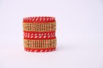 These are elegant, traditional red bangles featuring intricate golden beadwork and sparkling crystal embellishments. Perfect for festive and special occasions, they showcase a blend of classic and contemporary Indian design. Crafted with attention to detail, these bangles offer both durability and comfort. Suitable for women of all ages, these bangles provide a touch of grace and cultural heritage, making them a unique accessory for weddings, parties, and celebrations. Brand introduction, flavor profile, health benefits, and place of production are not specifically mentioned or visible in the provided images.