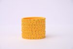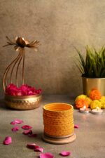 These handcrafted yellow bangles are part of a traditional Indian jewelry collection, known for their vibrant color and festive appeal. Expertly wrapped in satin thread and adorned with small metallic embellishments, these bangles are produced using traditional artisan techniques, ensuring durability and a refined finish. Designed to complement festive and everyday wear, the bangles offer a comfortable fit and a classic yet contemporary elegance. Ideal for gifting during Indian festivals like Diwali or weddings, these bangles are a perfect accessory to brighten any occasion. Made by skilled artisans in India, these bangles stand out with their meticulous detailing and vibrant hue, representing a fusion of cultural heritage and modern design.