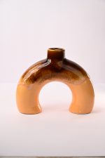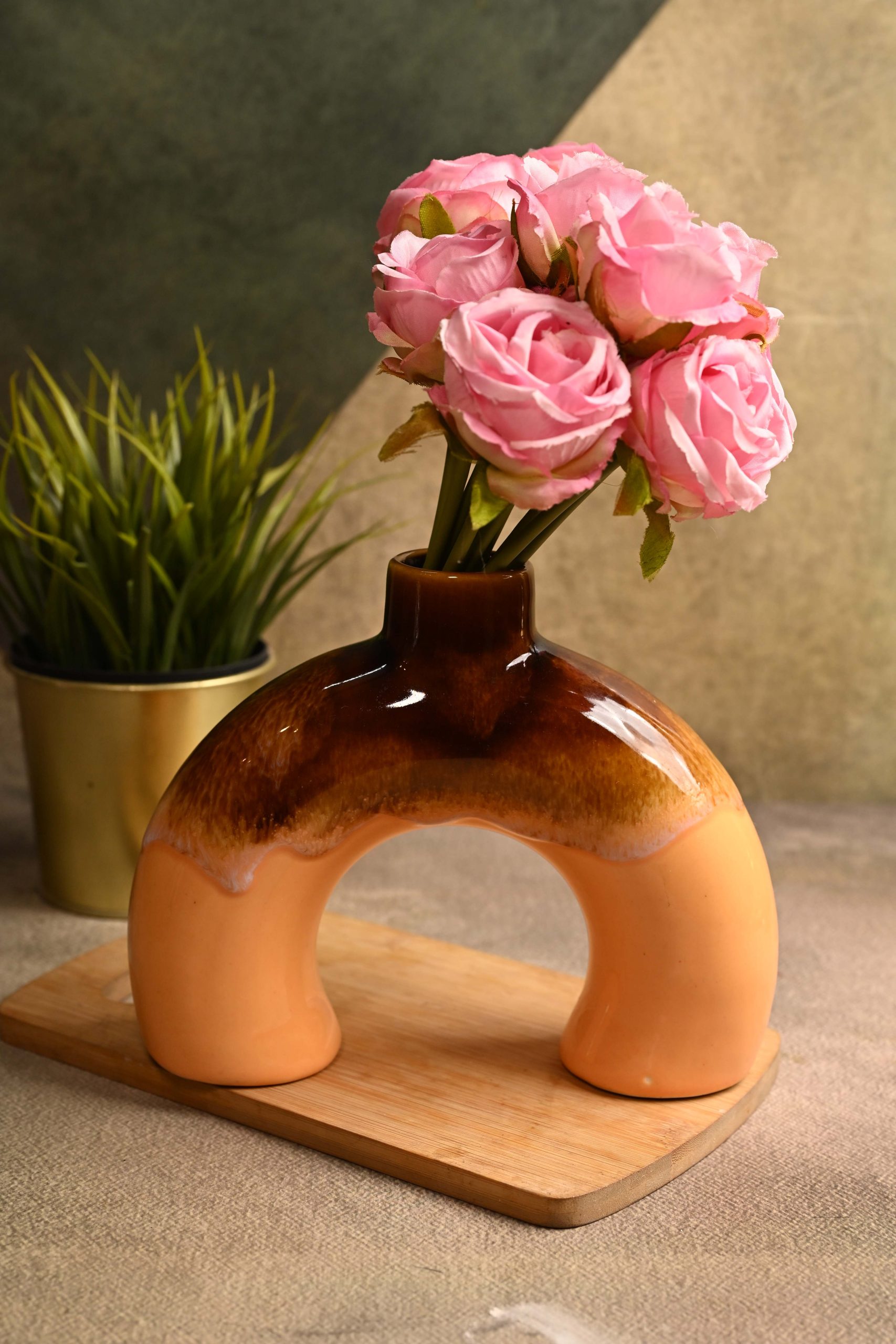 This decorative vase features an elegant and distinctive arched design with a two-tone color gradient, transitioning from a glossy brown to a subdued peach. Expertly crafted from high-quality ceramic, it adds an artistic touch to any living or work space. Suitable for artificial or fresh flowers, the vase showcases modern aesthetics blended with timeless appeal, making it a standout décor piece. The smooth glazed finish ensures durability while providing a gentle, reflective sheen, perfect for elevating the beauty of your floral arrangements. Its unique curved shape offers both stability and an eye-catching sculptural effect—ideal for homes, studios, offices, or gifting.