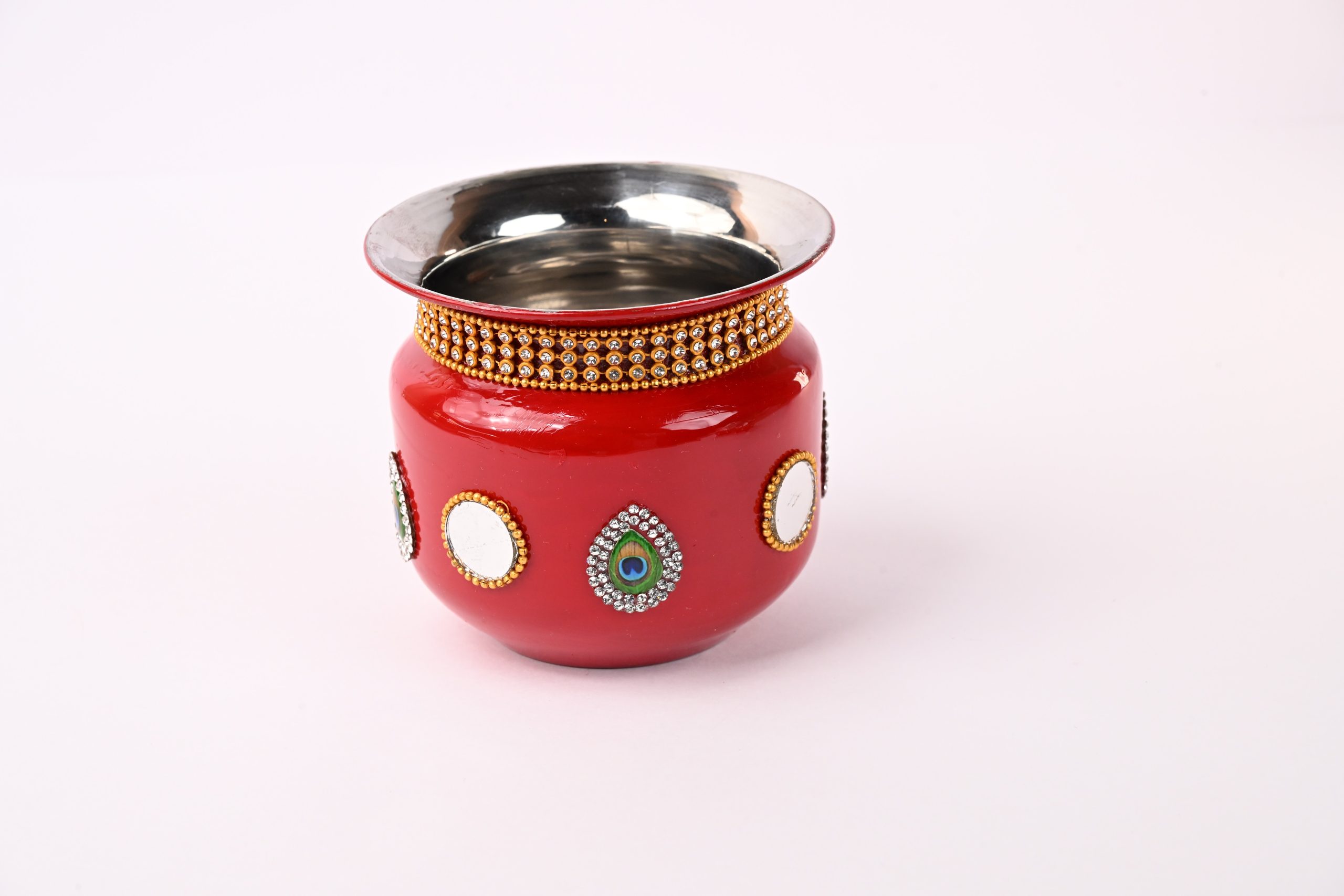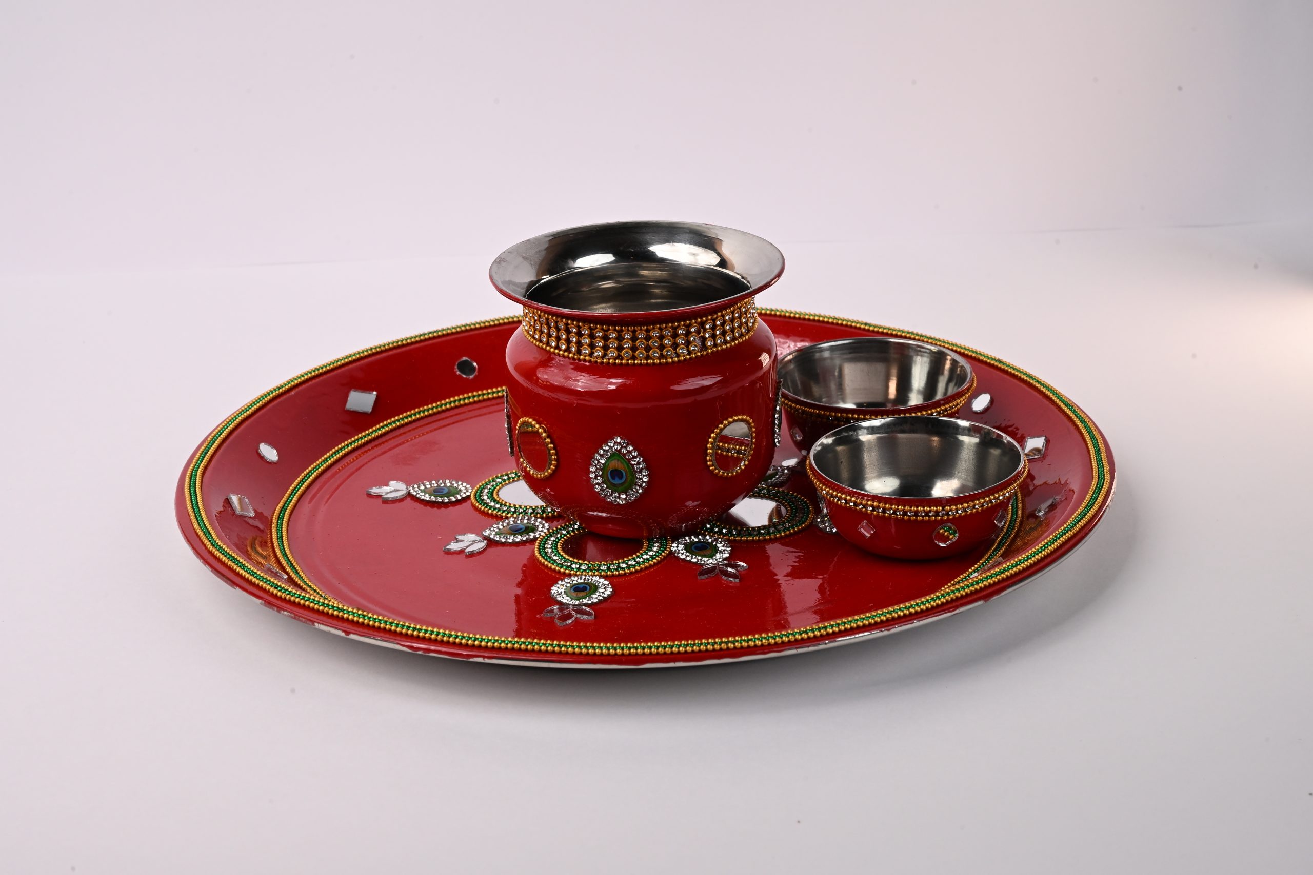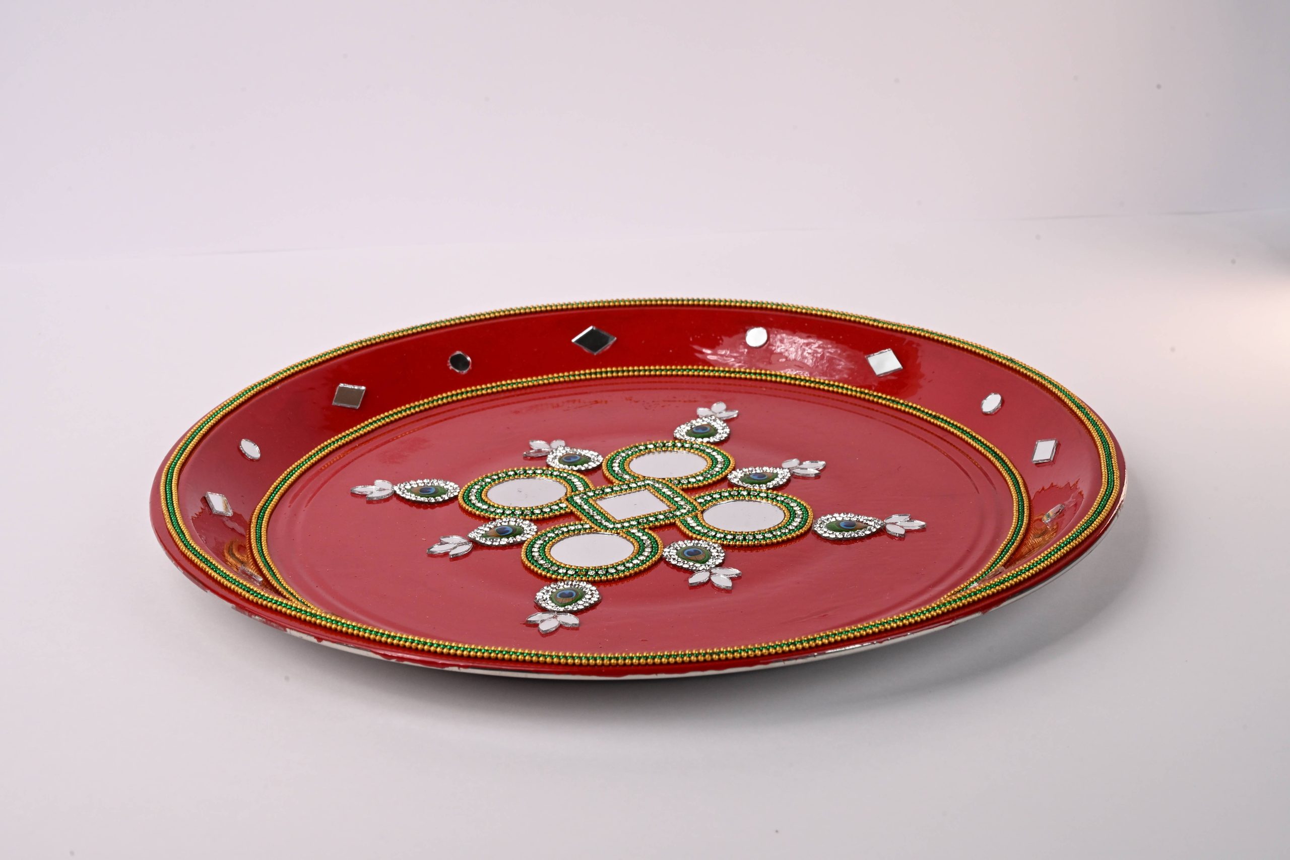 This is a beautifully handcrafted traditional Indian pooja thali (prayer plate), perfect for use during religious rituals, festivals, and special ceremonies. The thali is intricately decorated with embedded mirrors, beadwork, and vibrant traditional designs, reflecting the rich cultural artistry of India. It is typically crafted using high-quality, durable metal and painted in vivid colors. This pooja thali is ideal for holding essential ritual items such as kumkum, rice, water, diya (lamp), and flowers. Handcrafted by skilled artisans, this thali not only serves a spiritual purpose but also adds an aesthetic charm to prayer rooms. It is suitable for all age groups and makes a meaningful gift for festive celebrations.