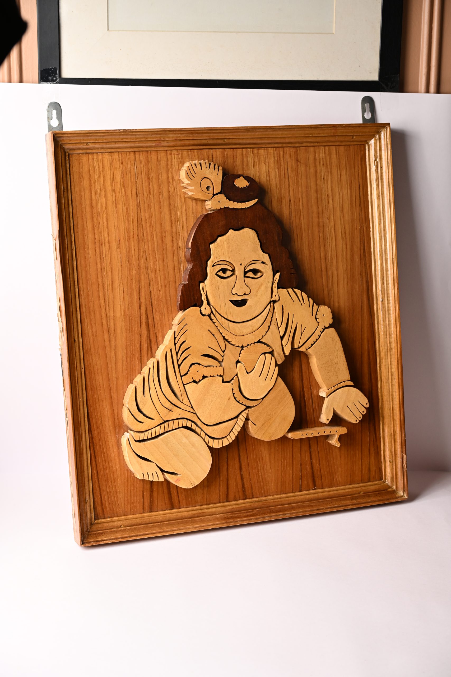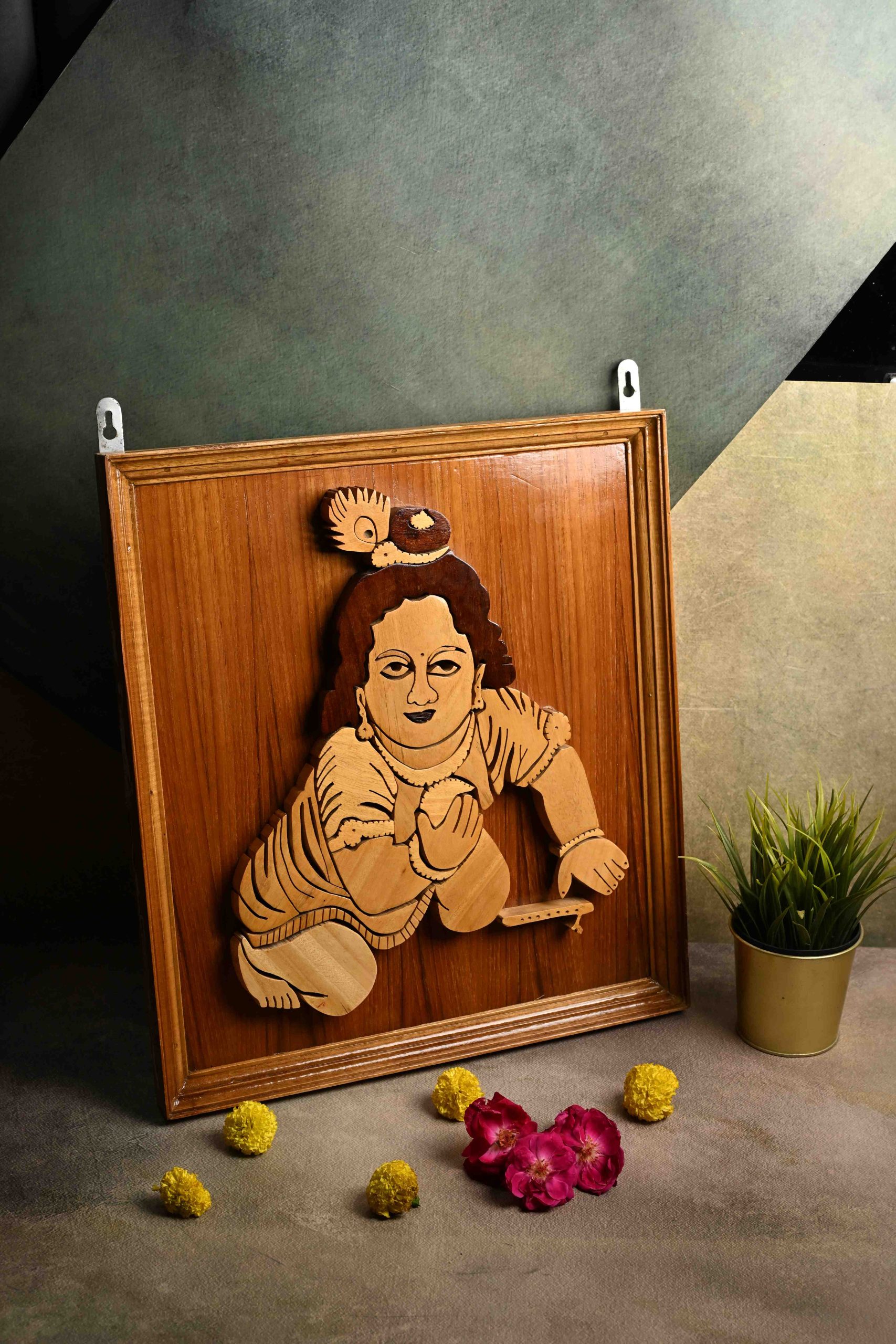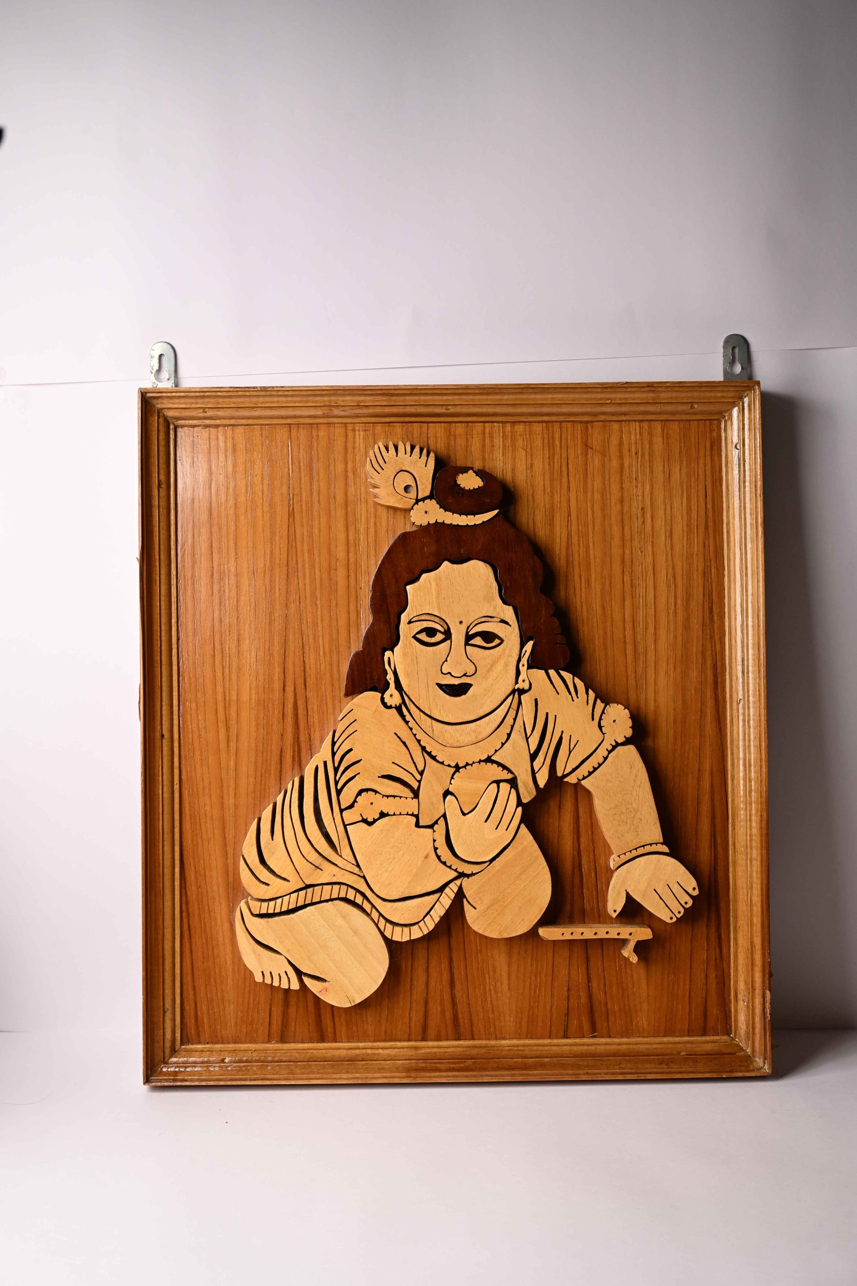 This handcrafted wooden wall art depicts Bal Krishna (Baby Krishna), an iconic and beloved Hindu deity symbolizing innocence, joy, and divinity. Carefully crafted using high-quality, naturally sourced wood, each piece is uniquely hand-assembled and finished to create a distinct and durable decorative piece. Ideal for sacred spaces, living rooms, or as a thoughtful gift, this artwork offers cultural significance and artistic value. The wooden texture delivers a natural, rustic charm, while the intricate design showcases skilled craftsmanship rooted in traditional Indian artistry. As a safe, non-toxic home décor, it is appropriate for households with children, cultural enthusiasts, and spiritual devotees alike. Place of production: India. Unique Selling Proposition: Handmade, eco-friendly, culturally meaningful wall décor.
