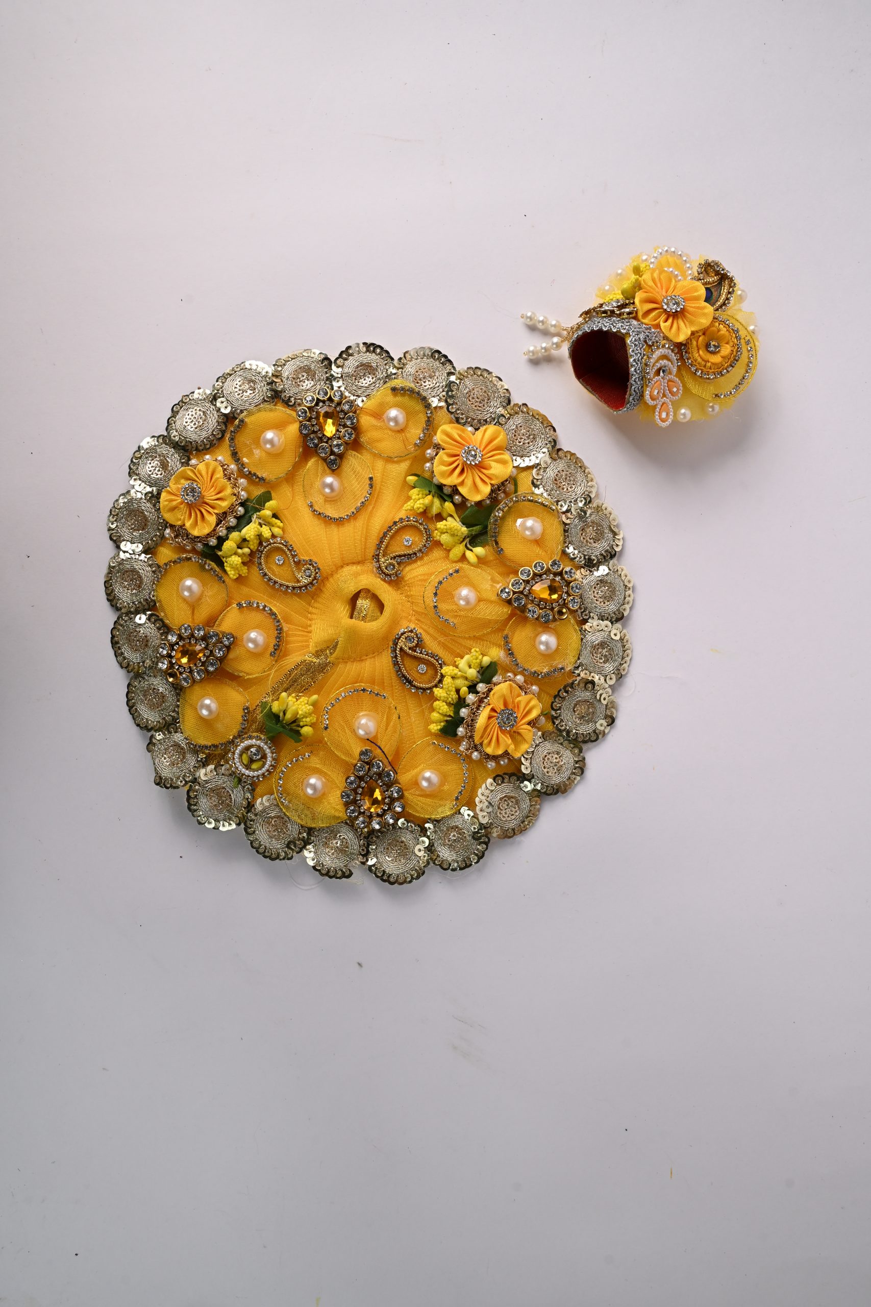 This is a traditional decorative dress set for Laddu Gopal, also known as Bal Gopal or Krishna Ji, used extensively in Hindu rituals and festivals. Made with high-quality, naturally sourced materials and adorned with artificial pearls, sequins, floral appliqués, and embroidery, the set is hand-crafted by skilled artisans for both daily use and special religious occasions. Designed to emphasize vibrancy and devotional charm, it offers a combination of bright yellow colors, intricate craftsmanship, and sparkling embellishments. Ideal for temple or home altar use, its unique selling proposition lies in the meticulous detailing and celebratory aesthetics inspired by Indian tradition. Suitable for all ages, this set brings auspiciousness and beauty to your pooja (prayer) space. Typically produced in traditional craft centers in India, it reflects cultural heritage and craftsmanship.