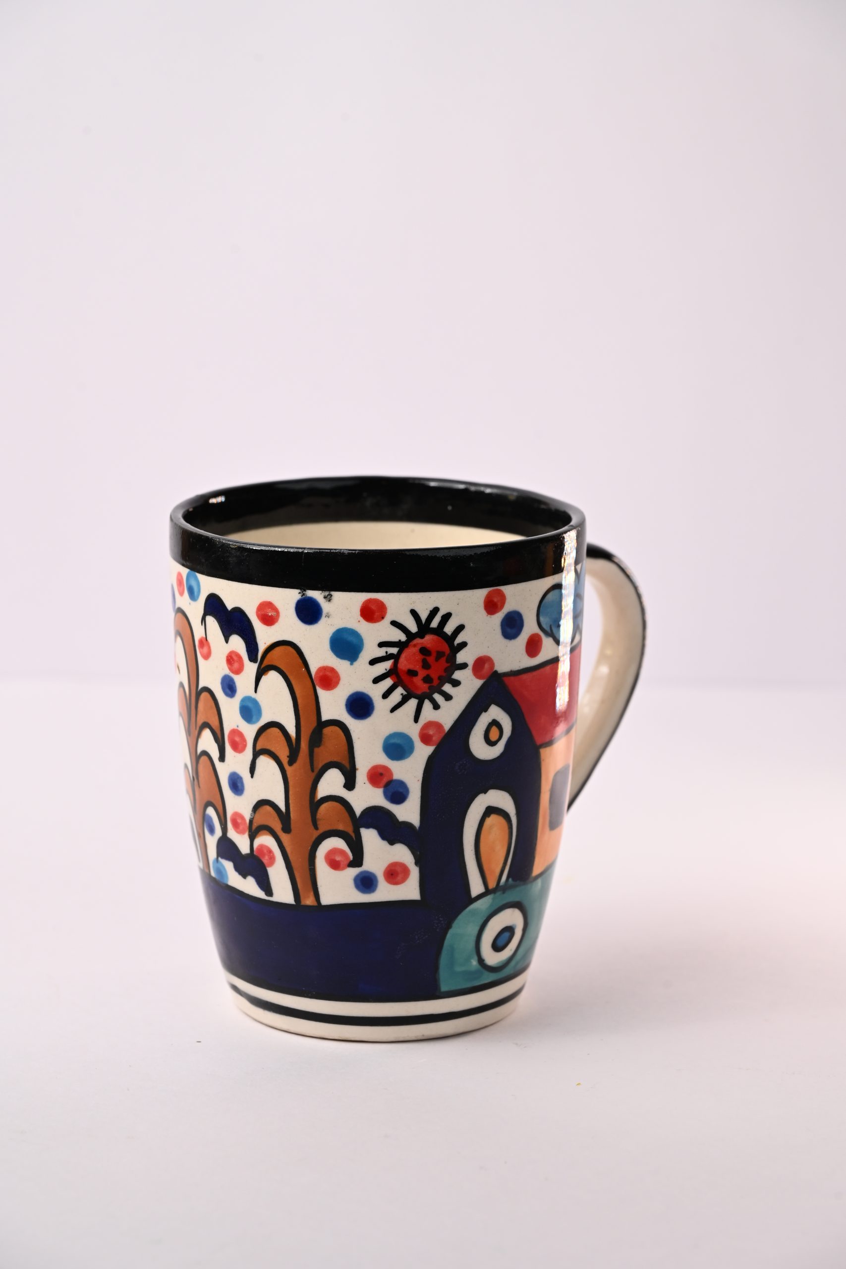 This is a beautifully hand-painted ceramic mug featuring a vibrant, artistic design. The mug showcases a playful landscape scene with colorful houses, trees, and abstract accents, lending a handmade charm to your kitchen collection. Crafted from high-quality ceramic, it offers durability and a smooth finish, ideal for both hot and cold beverages. Designed for everyday use, it is perfect for enjoying coffee, tea, or other drinks while adding an artistic touch to your tableware. The mug’s hand-painted nature makes each piece unique, celebrating artisanal craftsmanship. Suitable for all ages, this mug is a perfect gift or addition to any home looking for functional, yet decorative serveware.