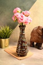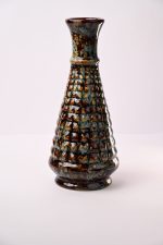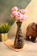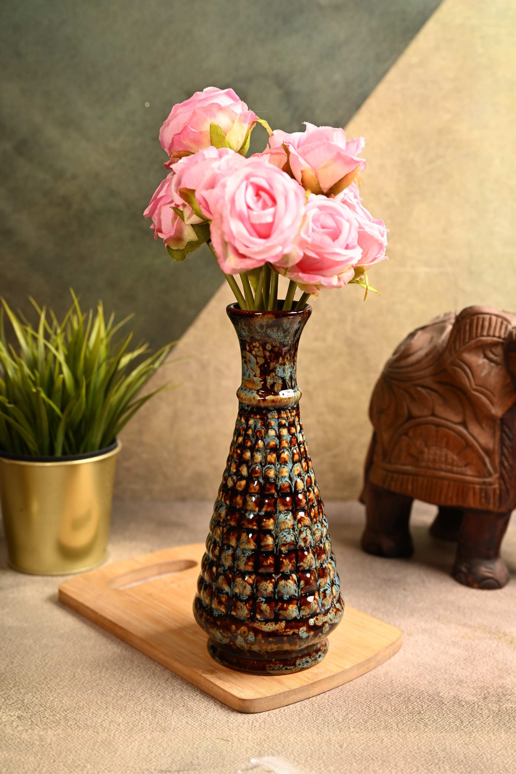 This is a uniquely crafted ceramic vase, ideal for home décor and floral arrangements. The vase features a textured, pyramid-like grid pattern with a glossy finish in rich, earthy tones of brown, blue, and hints of green. Handmade by skilled artisans, this piece embodies a blend of traditional craftsmanship and modern aesthetics, making it a striking centerpiece for contemporary or classic interiors. The ceramic material is naturally sourced and durable, ensuring longevity and timeless appeal. Perfect for displaying fresh or artificial flowers, the vase’s distinctive glaze and design make it a versatile decorative element for living rooms, dining spaces, or offices. Crafted with attention to detail, each piece is unique due to the artisanal glazing process, offering a one-of-a-kind addition to your décor collection. There are no age consumption restrictions, and it is suitable for use in any indoor setting.