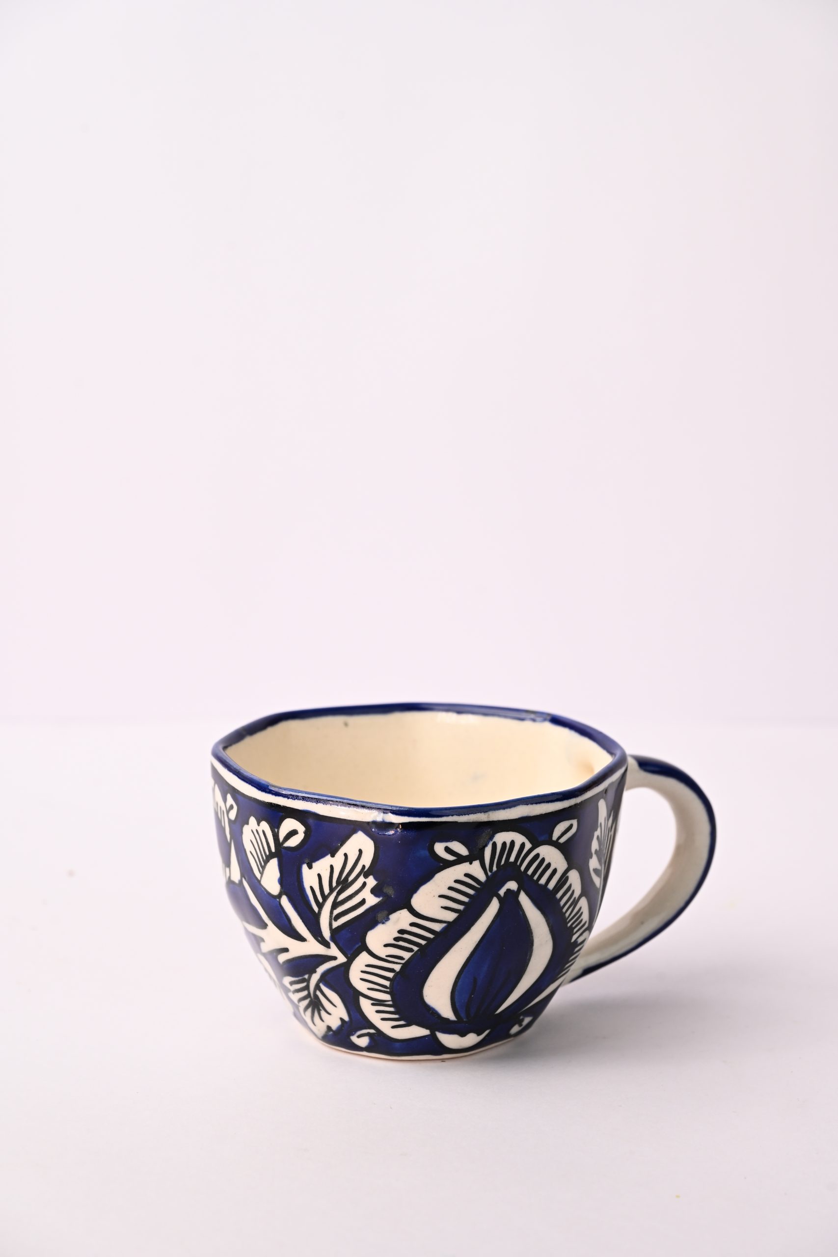 This artisanal ceramic cup features a deep blue floral motif with cream highlights, blending traditional craftsmanship with modern aesthetics. Handcrafted by skilled artisans, each piece showcases a unique, slightly irregular shape indicative of authentic, small-batch pottery. Perfect for serving tea, coffee, or herbal infusions, the cup offers a comfortable grip with its well-designed handle. The smooth glazed finish ensures a pleasant drinking experience and easy cleaning. Suitable for daily use, this cup elevates any beverage moment, making it an ideal choice for those who appreciate handcrafted, culturally rich tableware. USP: Distinctive hand-painted design rooted in local artistry, making every cup one-of-a-kind and adding a touch of elegance and tradition to your drinkware collection.