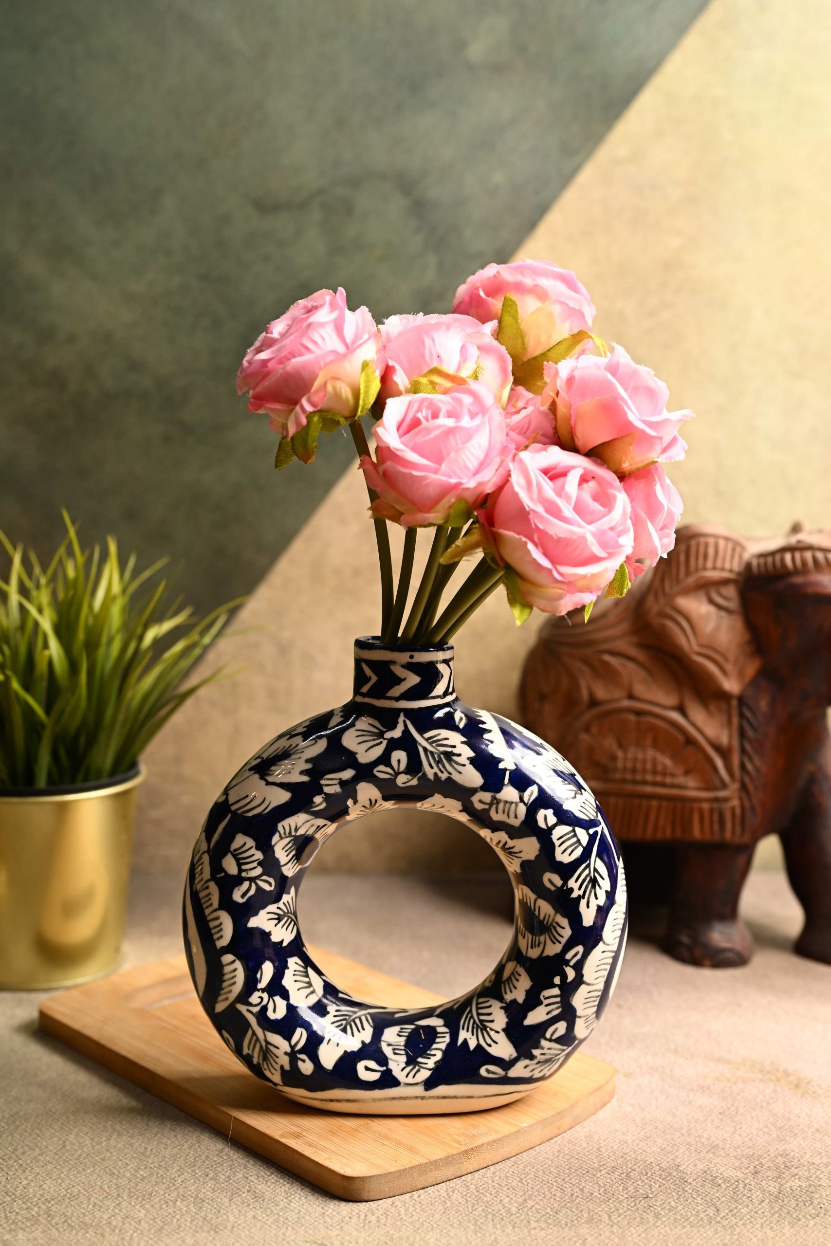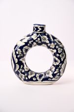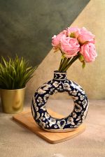 This product is a decorative round ceramic vase featuring a striking blue and white floral pattern. The vase is designed with a modern circular cut-out, making it a unique and stylish centerpiece for home or office decor. The brand focuses on artistic craftsmanship, with each piece hand-painted for a distinct, contemporary look. Suitable for displaying both artificial and fresh flowers, this vase can dramatically enhance the ambiance of living spaces, offices, or gifting occasions. The sturdy ceramic construction ensures durability, while the smooth finish highlights the elegance of the hand-painted details. USP: Its modern ring-shape combined with traditional hand-painted floral motifs makes it an exceptional choice for those seeking a blend of timeless artistry and modern design.