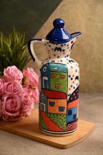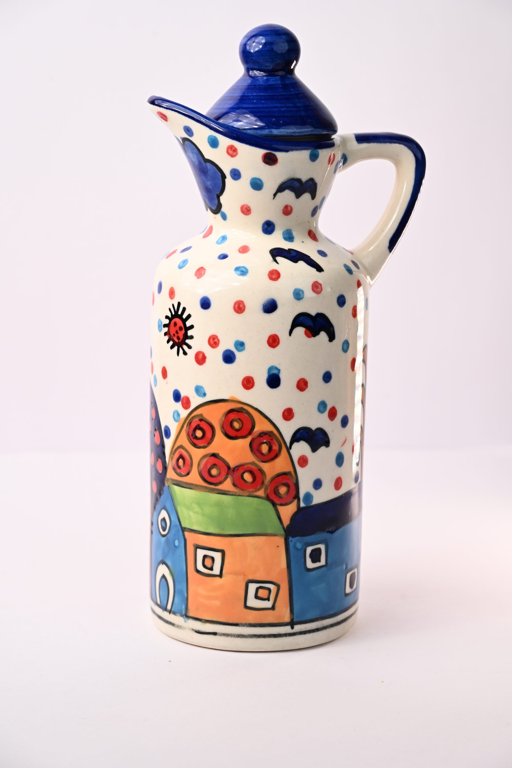 This is a hand-painted ceramic jug inspired by whimsical village and landscape art, likely crafted by skilled artisans. Known for its vibrant and playful design featuring houses, fields, birds, and sun motifs, this jug combines traditional pottery techniques with a modern, colorful aesthetic. Its durable ceramic construction keeps liquids cool and fresh, making it suitable for serving water, juices, or other beverages. With its eye-catching artwork, it doubles as a decorative piece, enhancing any kitchen or dining decor. The jug is likely produced in artisan pottery communities renowned for hand-painted ceramics, emphasizing organically sourced materials and lead-free paints. The smooth surface and sturdy build make pouring easy, while the snug blue lid preserves contents and adds charm. This product is suitable for all ages without consumption restrictions.