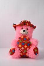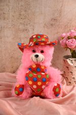 This is a vibrant pink teddy bear, designed to bring joy and comfort to children and loved ones. The plush bear features a soft, huggable texture with a whimsical touch added by its multicolored polka-dot hat, heart, and paw prints. With a cheerful and friendly appearance, this teddy bear is ideal for gifting on special occasions such as birthdays, Valentine’s Day, or anniversaries. Its cuddly and soft fabric makes it suitable for children of all ages, with no specific age restrictions. The bear is crafted from high-quality, hypoallergenic synthetic materials ensuring durability and safety, making it perfect for daily cuddles and decorative displays. Its unique selling proposition (USP) is the playful polka-dot pattern and striking pink color, standing out as a delightful keepsake or display piece for home or nursery décor.