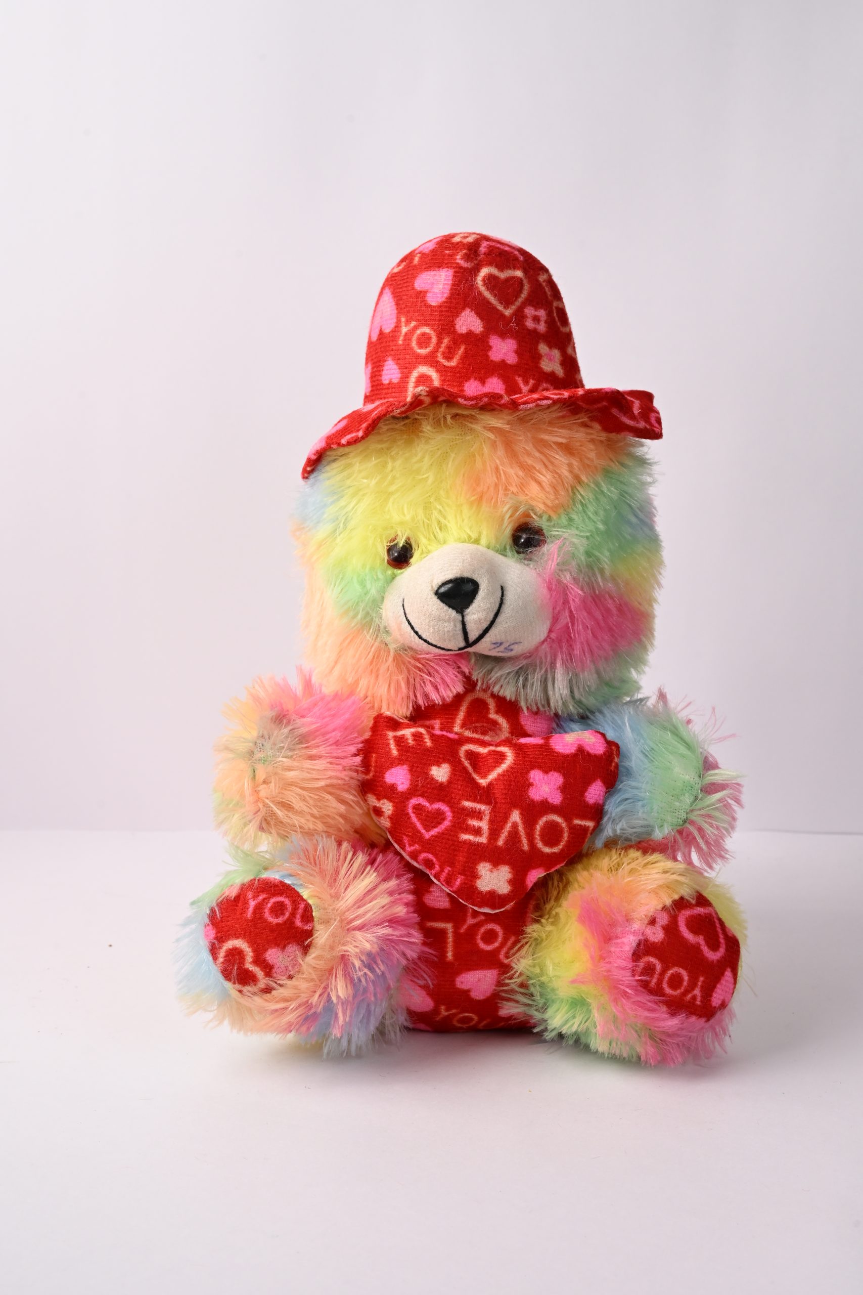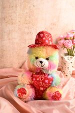 This is a colorful, multi-hued teddy bear plush toy featuring a soft and fluffy texture. The bear is adorned with a red hat and holds a heart-shaped pillow, both decorated with printed ‘LOVE YOU’ messages and charming heart patterns. Ideal for gifting on special occasions such as Valentine’s Day, birthdays, or anniversaries, this teddy bear offers a cheerful aesthetic and comforting tactile experience. Suitable for all ages, it is crafted from high-quality, non-toxic synthetic materials for durability and safety. With its vibrant design and loving theme, it serves as a heartfelt token for loved ones and makes a delightful decor accent in bedrooms or living spaces.