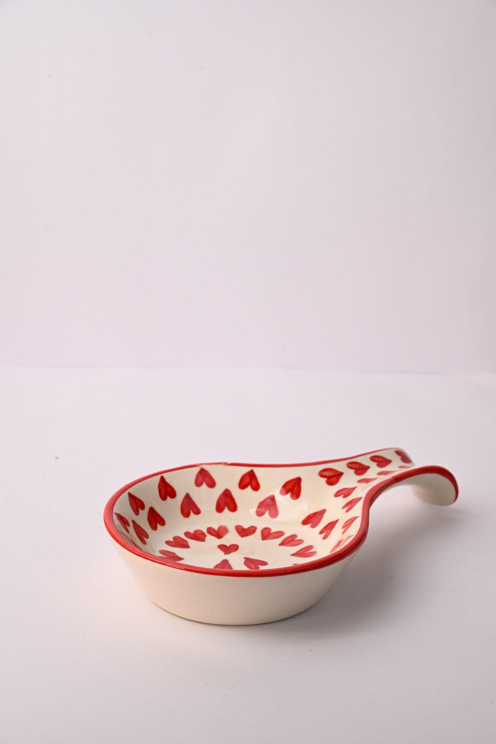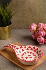 This is a beautifully crafted ceramic spoon rest featuring a lovely red heart pattern, perfect for adding a touch of charm and love to your kitchen space. The product combines aesthetic appeal with functional design, keeping countertops clean while you cook. Handcrafted with care, this spoon rest is made from high-quality ceramic, ensuring durability and ease of cleaning. Its unique curved shape securely holds cooking utensils, preventing messes and enhancing hygiene during meal preparation. Ideal for daily use or as a thoughtful gift, this item is both practical and decorative, suitable for kitchens seeking a blend of utility and style.