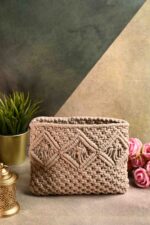 This handcrafted clutch bag is made from natural, high-quality cotton cord using traditional macramé techniques. The design features intricate, diamond-patterned knot work that blends durability with bohemian elegance. Produced by skilled artisans, this eco-friendly accessory exemplifies sustainable craftsmanship. The bag has a soft, textured feel, neutral color, and a geometric motif, making it a versatile statement piece for a variety of occasions. Its unique selling proposition lies in its artisanal, handmade nature and eco-conscious production, perfect for those seeking a functional yet stylish and sustainable accessory. Suitable for adults and teens, this bag is ideal for casual and semi-formal use.