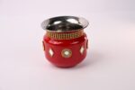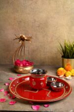 This is a traditional Indian pooja thali set, beautifully crafted and decorated with intricate patterns and mirror work, perfect for all kinds of religious ceremonies and festive rituals. The thali, made from premium metal and finished with a stunning red gloss, features an auspicious Swastik design—a revered symbol in Hindu culture for prosperity and good fortune. The brand emphasizes handmade craftsmanship, blending tradition with modern elegance. This set is suitable for use during poojas, aartis, and festive occasions. It contains no food or consumable items, making it safe for all age groups with no health restrictions. Ideal for gifting and enhancing the spiritual atmosphere at home, it is produced using finest traditional methods to uphold cultural authenticity, with decor elements that add to its unique charm.