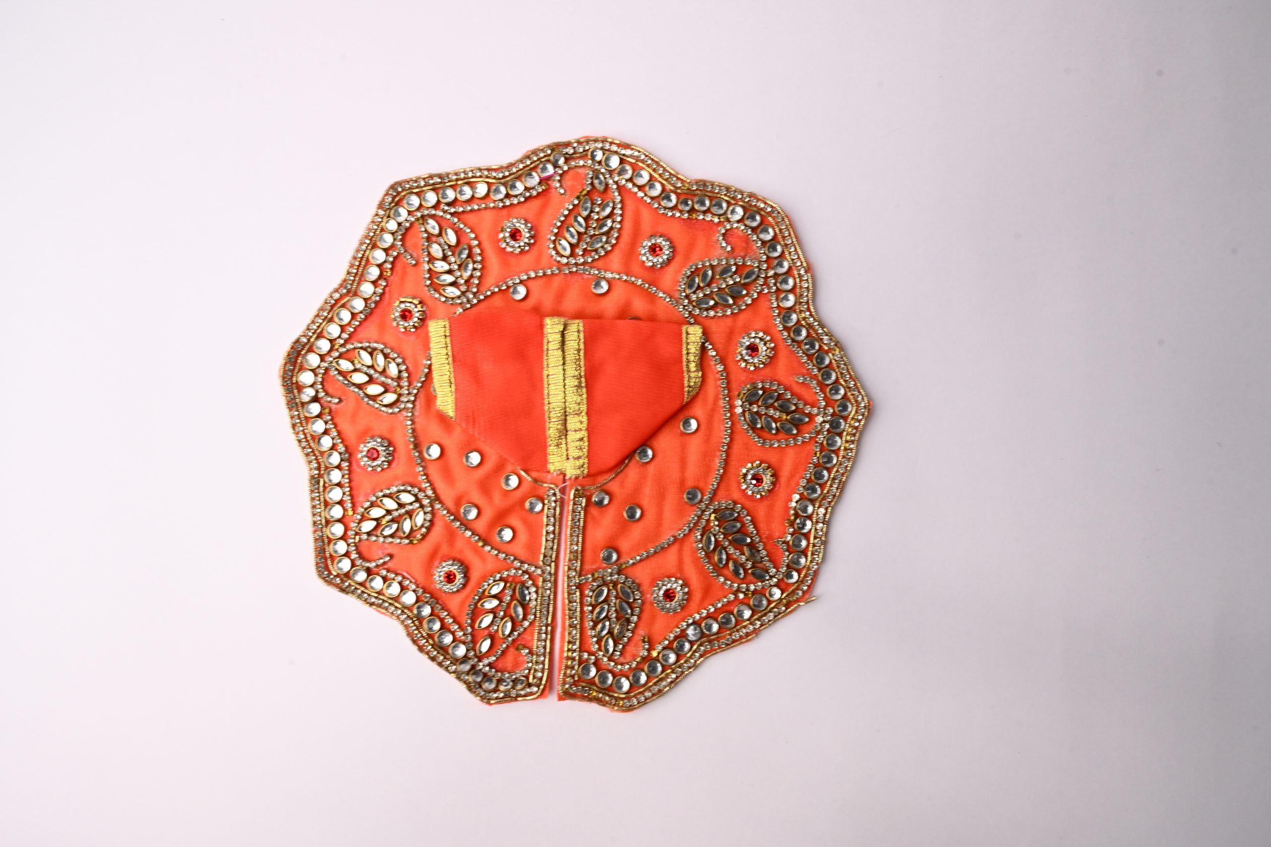 This is a beautifully handcrafted orange dress or attire, typically used for adorning Hindu deities such as Lord Krishna or idols during prayers and festive rituals. The product showcases intricate beadwork, mirror embellishments, and traditional embroidery, reflecting the rich artistry of Indian textile craftsmanship. Often produced by skilled artisans using organic, naturally sourced fabrics and traditional methods, this attire not only enhances the visual appeal of home altars but also celebrates cultural heritage. Made in India, its unique selling proposition lies in its detailed craftsmanship, auspicious color palette, and use of premium materials, making it an exceptional decorative accessory for religious ceremonies and festive occasions. Suitable for all ages (no age consumption restrictions), this product is designed for devotional and decorative purposes, bringing vibrancy and a spiritual ambiance to any setting.