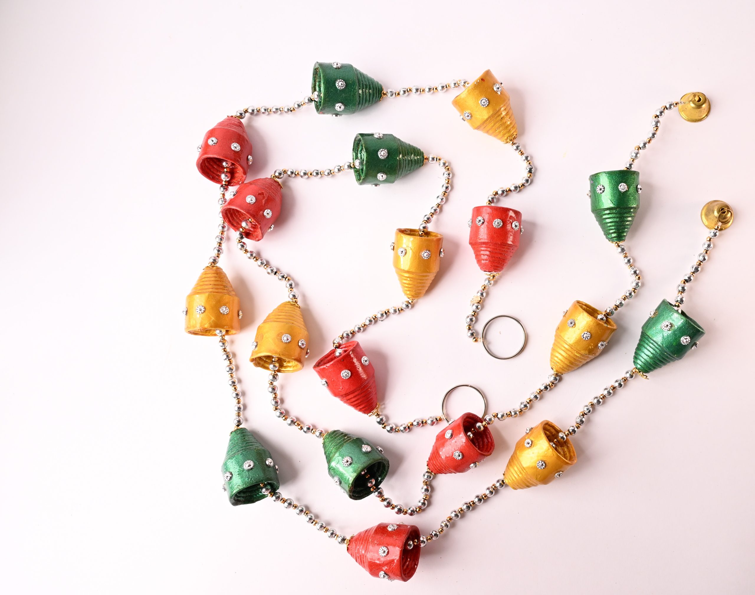 This product is a traditional decorative garland, often used in Indian households and religious ceremonies. Handcrafted using eco-friendly paper, it features bell-shaped ornaments in vibrant red, green, and yellow, embellished with sparkling stones and assembled on a metallic bead string. This garland not only elevates festive decor but also adds a touch of cultural elegance to any setting. Produced by skilled artisans, it highlights sustainable craftsmanship and can be used for puja, home decor, or special celebrations. Its unique selling proposition is its blend of bright colors, artisanal detailing, and long-lasting build suitable for multiple festive occasions.